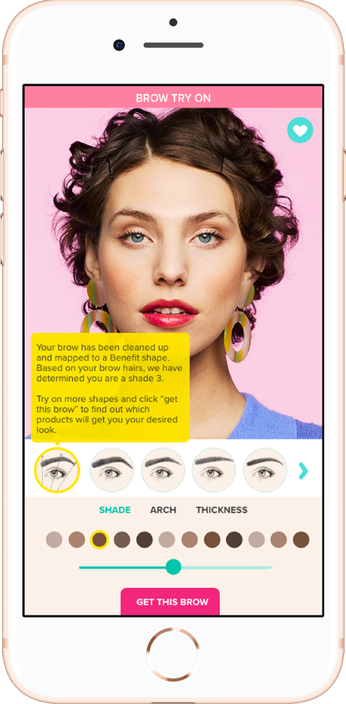 Benefit’s Brow Try-On is a next-gen AR brow experience. Users are able to virtually “try on”a variety of brow looks so they can see—on their own face—the transformative power brows have on their entire look. As the lead designer, I worked with the technology partner to define the styles and ensure that the quality of the AR was realistic and approachable.