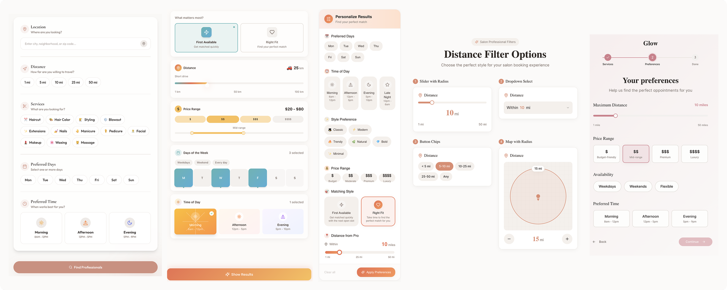 I’m exploring adding a simple personalization entry point in search that lets clients share what they care about, like preferred days and times, style or service type, and distance. The goal is to give users more control over their results while helping us surface more relevant matches and drive higher-quality bookings.
