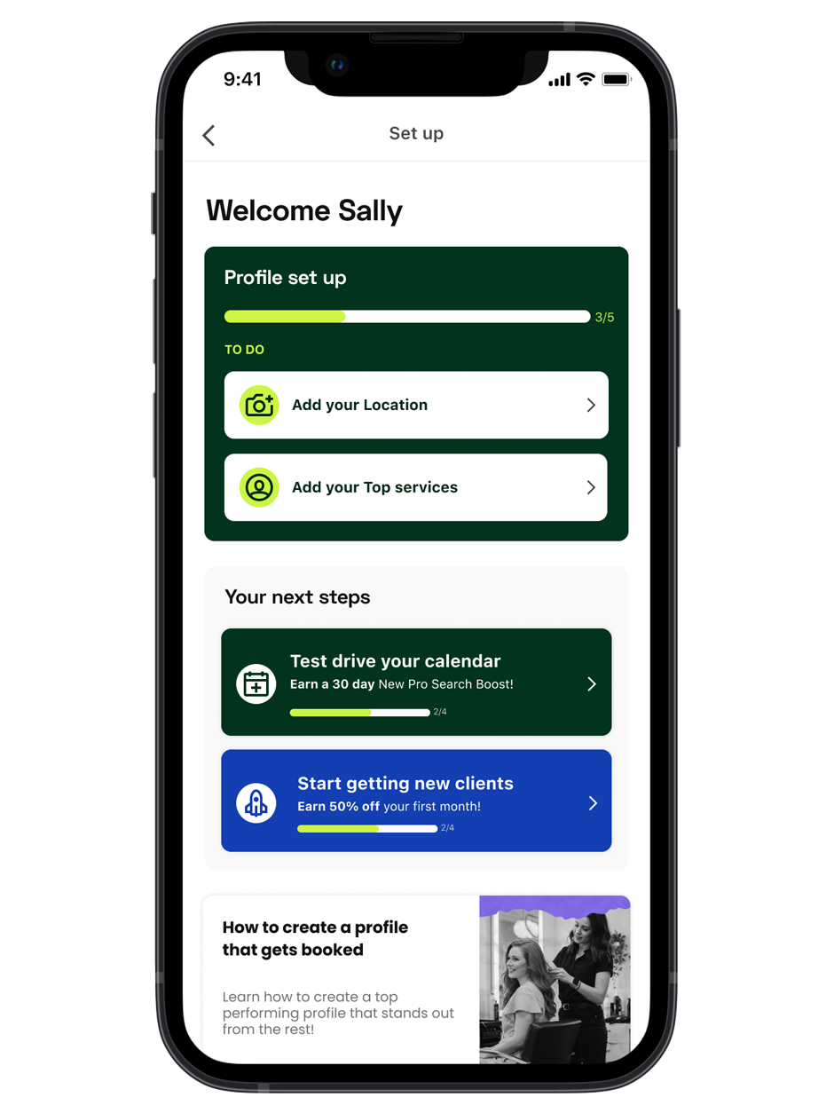 Increase activation and reduce time-to-first-booking by guiding new Pros toward the highest-impact setup actions and clearly communicating the value of StyleSeat’s marketplace.